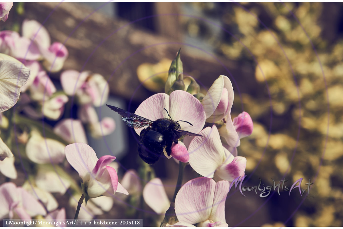 Holzbiene sammelt Nektar an der Blüte einer Platterbse